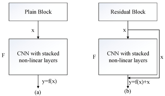 where and stand for the input and output of the k-th residual unit, respectively. is the residual mapping that must be learned. The activation function is denoted by f and the convolution kernel by W. Figure 7a displays the CNN learning block with less stacked non-linear layers through a direct mapping representing and x as stacked non-linear layers and the identity function, respectively. Figure 7b shows the identity mapping through the residual function , where , as proposed in [32].