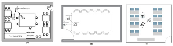Different room layout for data collection. (a) The rest-room layout. (b) The meeting room layout. (c) The class-room layout.