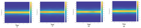 The time-frequency diagrams of four kinds of activities. (a) Jumping. (b) Walking. (c) Squatting. (d) Leg lifting.