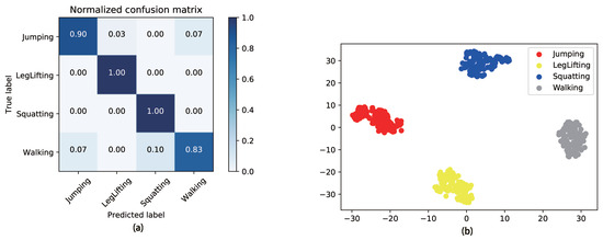 The scene’s computers are equipped with an NVIDIA GeForce GTX 1660S GPU, an Intel 10500 CPU, and 32 GB of RAM. Then, use the cross-entropy loss function. If the predicted value is the same as the true value, it approaches 0. If the predicted value is different from the true value, the cross-entropy loss function will become very large. Training and testing curves are, respectively, recorded in Figure 11 and Figure 12, which represent the value changes in accuracy and loss in the training and testing process. Both can converge after 20 iterations. In addition, a detailed evaluation of the classification result is conducted using three types of metrics. The metrics are defined as follows: (1) Precision is defined as , where the ratios of correctly marked activities () and erroneously marked activities () are expressed. (2) is the definition of recall, where represents erroneously promoted negative samples. (3) The formula for the F1-score (F1) is . Table 2 tabulates the testing data and shows the high precision and F1-score. Figure 13a shows the confusion matrix whose rows represent the predicted activity and columns refer to the actual activity. We find that the accuracy of leg lifting and squatting can achieve 100% due to their obvious features, and the average accuracy is 94.2%. Walking and jumping have similar movements, so the accuracy of recognition is not as good as it is for the other two activities. The dispersion of various activity data is displayed using the ResNet18 model under T-SNE visualization in Figure 13b. It can be intuitively seen that the model can distinguish different activities well.