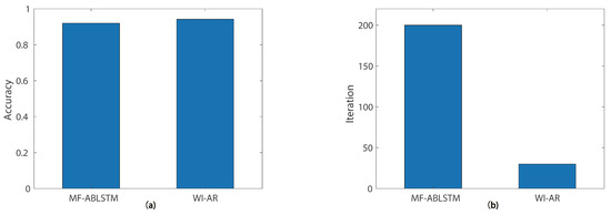 Moreover, MF-ABLSTM [36] leverages attention-based long short-term memory neural network and time–frequency domain features for small CSI sample-based activity recognition, achieving 92% with 490 training and testing samples after 200 iterations. Due to the proposed method being able to train very deep neural networks, it avoids the problem of gradient vanishing and improves the model’s expressive power and performance. It uses residual connections to preserve the original features, making the learning of the network smoother and more stable, further improving the accuracy and generalization ability of the model. During training, gradient vanishing and exploding problems can be avoided, accelerating network convergence. Therefore, Wi-AR achieves 94.2% with 600 samples after 30 iterations. The results of the comparison are, respectively, shown in Figure 14a,b, which demonstrate that our proposed Wi-AR scheme achieves higher accuracy with fewer iterations for small sample-based activity recognition.