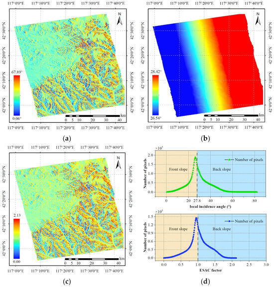 Figure 4 shows the ESAC factor (Figure 4c) extracted based on Equation (10) with local incidence angle (Figure 4a) and radar incidence angle (Figure 4b) as input parameters. As can be seen from Figure 4d: (1) the ESAC factor value of the pixel at the front slope (θloc < θref) is less than 1.0, resulting in a decreasing trend of the backscattering coefficient after ESAC; (2) the value of ESAC factor of the pixel on the flat ground (θloc = θref) is equal to 1.0, resulting in no change in the backscattering coefficient after ESAC, which is equivalent to no ESAC performed on the pixel of flat ground; (3) the ESAC factor value of the pixel at the back slope (θloc > θref) is greater than 1.0, resulting in an increasing trend of the backscattering coefficient after ESAC; (4) in general, the SAR information of pixels with different slope is similar to that of flat ground under the same conditions by applying ESAC factor.