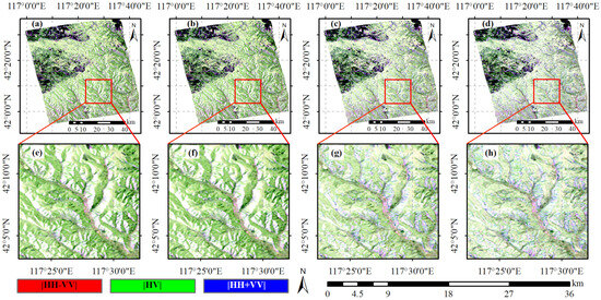 Table 4 lists the optimal n values corresponding to the three polarization channels of all date data in the PolSAR dataset. Among them, the optimal n values of the three polarization modes of the same date data are different, and the rule of nHV > nHV > nVV exists, indicating that there are different degrees of AVE phenomenon in different SAR data scenes, but among the three polarization channels, the weakest AVE phenomenon exists in the HV polarization channel.