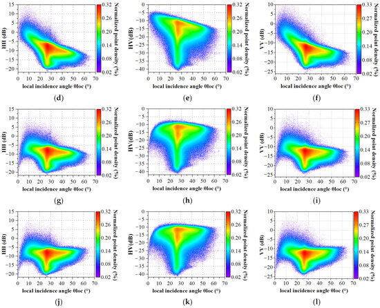 Scatter density plots of local incidence angles θloc and backscattering coefficients at different correction stages, including no radiometric terrain correction (NRTC), polarization orientation angle correction (POAC), effective scattering area correction (ESAC) and angular variation effect correction (AVEC). (a) HH_NRTC; (b) HV_NRTC; (c) VV_NRTC; (d) HH_POAC; (e) HV_POAC; (f) VV_POAC; (g) HH_ESAC; (h) HV_ESAC; (i) VV_ESAC; (j) HH_AVEC; (k) HV_AVEC; (l) VV_AVEC.