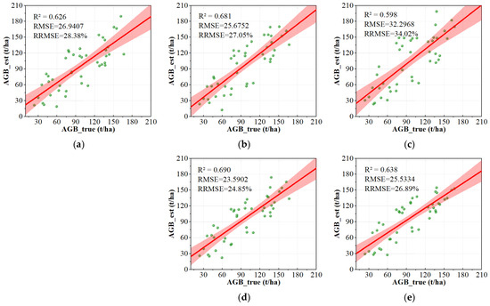 To explore the robustness of the RTC under various AGB inversion models and PolSAR data, we first fit five AGB inversion models (Equation (14)) at each stage of the RTC and evaluate these models. It can be seen from Table 6 that in all the tested models, R2 values of the three polarization channels increase with the advance of the RTC stage, indicating that different RTC stages can play a role in these five models, and the contribution of ESAC is the most obvious. In addition, among the three polarization channels, the R2 value of the HV polarization channel is the largest, indicating that the backscattering coefficient of the HV polarization mode has the best fitting effect with AGB. Compared with M0, M1 has better fitting results at any RTC stage, indicating that AGB is not simply linear with the backscattering coefficient and that the logarithmic transformation of AGB can effectively improve its fitting effect with the backscattering coefficient. Although model 3 (M3) is numerically optimal, there is no quadratic polynomial relationship between AGB and backscattering coefficient in theory, which indicates that the model is overfitting. However, the R2 value of M3 steadily increases in each stage of RTC, indicating that the terrain correction effect of the RTC process is still relatively robust for M3. Although model 4 (M4) has a better R2 value without RTC, it has a greater improvement after RTC, indicating that the backscattering coefficients of HH and VV polarization channels can also contribute to AGB estimation. Compared with the independent use of HV polarization channel (M2), the simultaneous participation of three polarization channels in AGB inversion can compensate for the influence of terrain and has better AGB inversion potential, but RTC is still essential. In conclusion, RTC has good robustness in different statistical models, among which M2 is the best univariate model, and the backscattering coefficient of the HV polarization channel has the best fitting effect with the measured AGB, which can be used as the best variable of the univariate model. In addition, M4 is slightly better than M2, which has greater inversion potential.