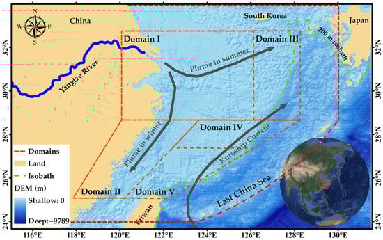 The ECS is located along the eastern coast of China, adjoining the Kyushu and Ryukyu Islands of Japan in the west. It occupies an area of approximately 800,000 km2, with over half comprising a continental shelf, while an arc-shaped continental slope and the Okinawa Trough stretch across its eastern boundary. The predominant currents are the Kuroshio Current and its tributaries, the Tsushima Warm Current and the Taiwan Warm Current [21], which transport warm and saline Kuroshio waters into the ECS. The upwelling of Kuroshio subsurface waters provides a vital nutrient supply, fertilizing the whole of the ECS continental shelf [22]. The Changjiang River constitutes a major freshwater influx, discharging around 940 km3 annually, with peaks in summer [23]. The Changjiang plume flows northeastwards in summer but reverses southwestwards in winter (Figure 1), feeding into the southward Fujian-Zhejiang coastal current [24,25].