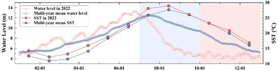 Water level for the Changjiang River and mean SST for the Changjiang plume. The blue box covers July–September and the red box covers October–December.