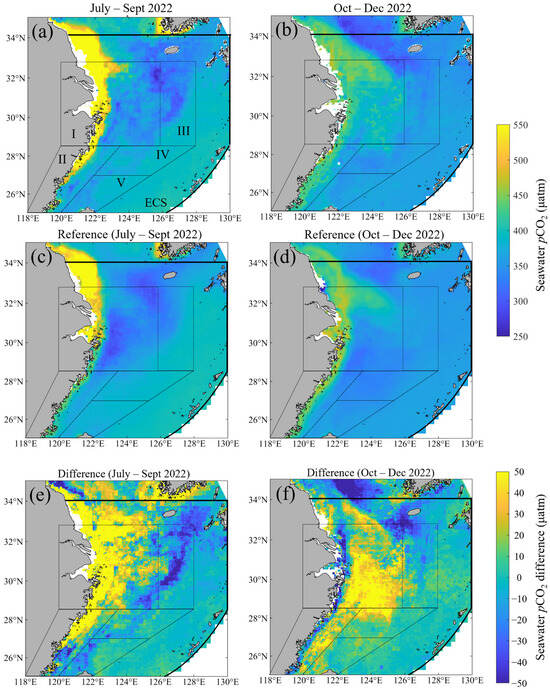 Satellite-derived mean seawater pCO2 (a,b), reference seawater pCO2 (c,d), and differences between them (e,f) in July–Sept and Oct–Dec 2022. The seawater pCO2 difference was calculated by subtracting the reference pCO2 from the satellite-derived pCO2 in 2022. Specifically, the data in (e) are those in (a) minus those in (c), and the data in (f) are those in (b) minus those in (d).