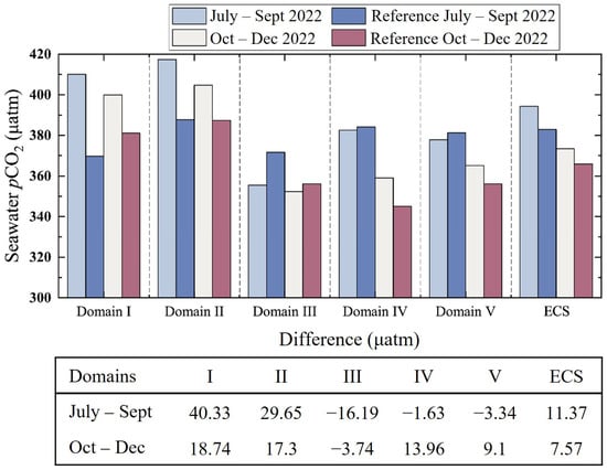 Comparisons between regional means of the satellite-derived seawater pCO2 and the reference pCO2 during July–Sept and Oct–Dec 2022 in the five domains and the entire ECS. In the side table, the numbers show the differences between the satellite-derived and the reference seawater pCO2. Table S1 shows the exact values for each of the regions.