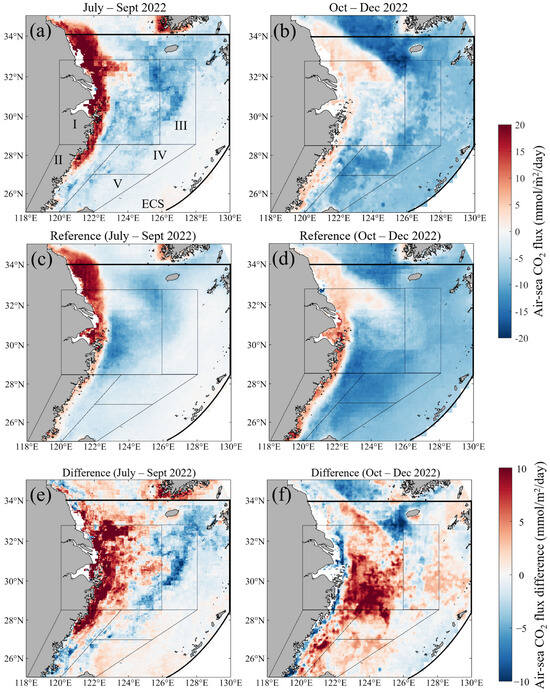 During the months from October to December 2022, the sea–air CO2 flux differences between the satellite-derived and reference values on the ECS shelf were notably positive, except for the very near-shore water and the region to the southwest of Jeju Island, also indicating a weakened CO2 uptake. Specifically, the CO2 uptake capabilities of Domains I and II were found to be reduced by approximately 50%, resulting in values of −2.39 and −1.29 mmol/m2/day, respectively. Domains IV and V also exhibited 15–20% lower values, resulting in regional mean values of −9.63 and −8.16 mmol/m2/day, respectively. The mean flux in Domain III was consistent with the reference value. Overall, the actual sea–air CO2 flux in the entire ECS was −6.31 mmol/m2/day.
