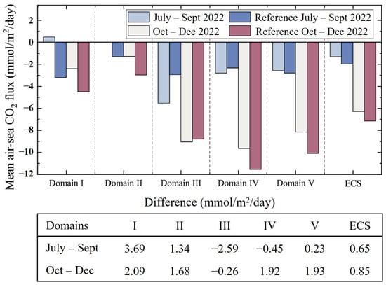 Comparisons between the satellite-derived mean sea–air CO2 flux and the reference sea–air CO2 flux during July–Sept and Oct–Dec 2022 in the five domains and the entire ECS. In the side table, the numbers show the differences between the satellite-derived and the reference sea–air CO2 flux. Table S2 shows the exact values for each of the regions.