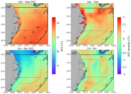 SST (a,b) and SST anomaly (c,d) in Jul–Sept and Oct–Dec 2022. SST anomalies were calculated by subtracting the climatological mean SST (2003–2021) from the SST in 2022.