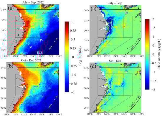 Sea surface Chl-a (a,b) and Chl-a anomaly (c,d) in Jul–Sept and Oct–Dec 2022. Chl-a anomalies were calculated by subtracting the climatological mean Chl-a (2003–2021) from the Chl-a in 2022.