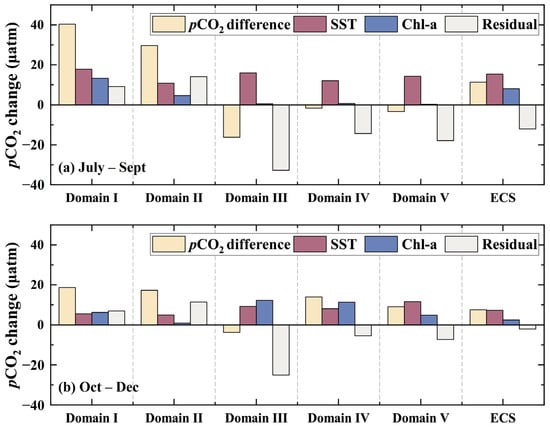 Contributions of the SST and Chl-a to the seawater pCO2 difference (compared to the reference) in (a) Jul–Sept and (b) Oct–Dec 2022. Residuals were calculated by subtracting the SST and Chl-a contributions from the total pCO2 difference. Table S3 shows the exact values for each of the regions.