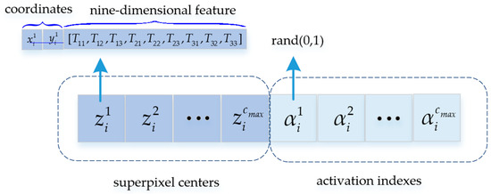 In the automatic optimization layer, each individual in the population is one solution of superpixel segmentation for the observed PolSAR image. Figure 2 shows the individual encoding in the automatic optimization layer. Each individual consists of two parts, the superpixel centers and the activation indexes. The number of superpixel centers is . Each superpixel center is represented by 11 genes, coordinates, and nine-dimensional features. The value range of the activation indexes is . There is a one-to-one correspondence between the superpixel center and the activation index. Only when the activation index is not less than 0.5 is the corresponding superpixel center effective, which is regarded as one candidate superpixel center. Thus, the individuals with the same length in the population have a different number of superpixels.