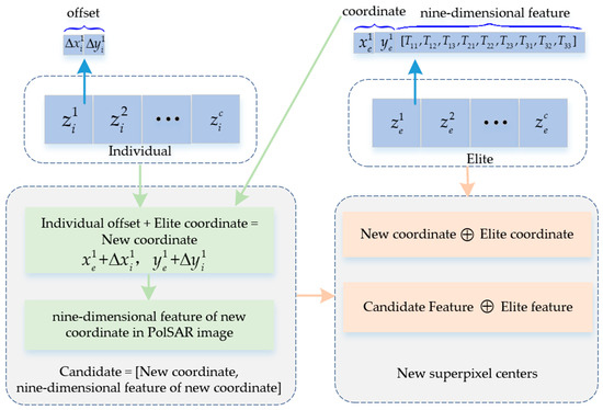 Based on the superpixels obtained by the automatic optimization layer, the search of the fine segmentation layer aims to further improve the qualities of the superpixels. Thus, the encoding strategy is the offset of the coordinates of superpixel centers in the fine segmentation layer. The values of the offset are selected with the range of randomly, where is the grid width of each region obtained by dividing the observed PolSAR image into square regions. As shown in Figure 4, the individual is encoded as a set of coordinates for the superpixel centers, where is the number of superpixels. Let a set of superpixel centers be elite. Combining the offsets of the individual and the coordinates of superpixel centers of the elite, a candidate of superpixel centers can be obtained, which is composed of the new coordinates of superpixel centers and the corresponding features in the PolSAR image. Then, a new set of superpixel centers can be obtained by fine-tuning the elite with the candidate, which can be computed by: