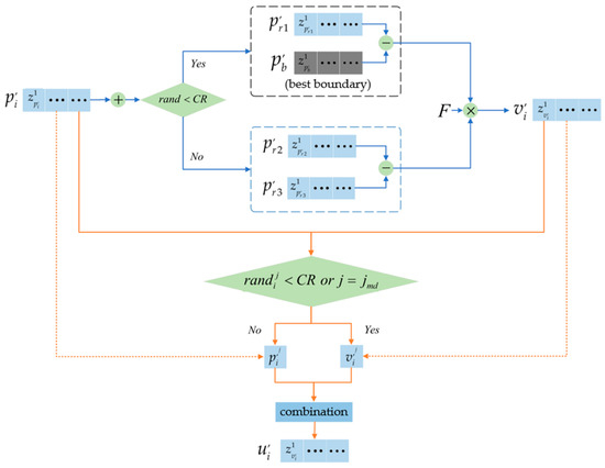 In Equation (18), the evolutionary operation between the candidate individual and the parent individual to generate the offspring is similar to Equation (14) in the automatic optimization layer. is the individual with the best boundary quality in the population. The boundary quality of each individual can be measured by: