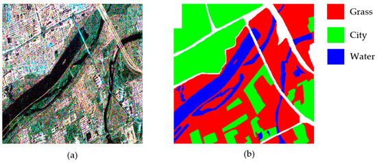 The Wei River in Xi’an dataset [46] was generated in January 2010 under the fine quad-polarization model of a RADARSAT-2 sensor. The image size is 512 × 512 and the resolution is 10 × 5 m, as shown in Figure 7. There are three types of features in this area, Grass, City, and Water.