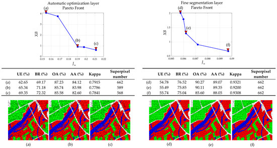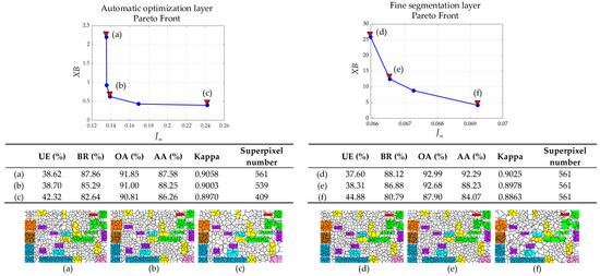 where and are the boundary pixels obtained from the ground truth and the superpixels, respectively. denotes the number of pixels in the boundaries of the ground truth. A large value of BR indicates that the superpixels are not bad quality. In addition, the overall accuracy (OA), average accuracy (AA), and Kappa coefficient are utilized to quantify the classification performance of the superpixels [49].