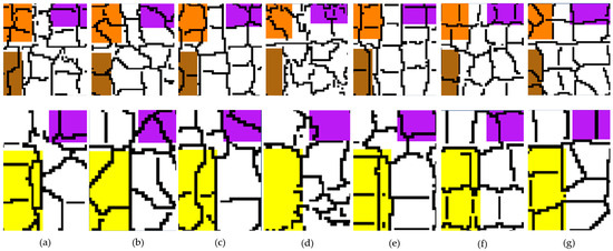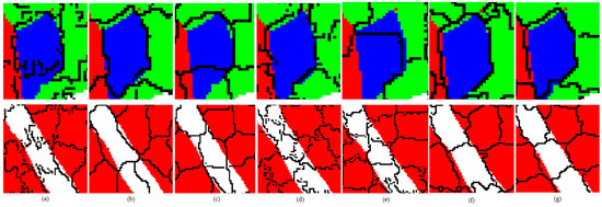 With the exact number of superpixels, the fine segmentation layer pursues better performance on the basis of the superpixels obtained by the automatic optimization layer. The objective functions in Equations (4)–(7) are still used as the fitness functions in the fine segmentation layer. The encoding strategy and the evolutionary operators are designed to further improve the qualities of superpixels.