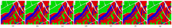 Considering the scales of different scenarios, the values of are set as 800, 1100, and 2000 for the Flevoland dataset, the Wei River in Xi’an dataset, and the San Francisco dataset, respectively. Considering the trade-off between the search ability and computation cost, the population size and the maximum generation number are set as five and ten for both layers in MOES, respectively. Figure 9 shows the sensitivity studies of the parameter in the Wishart distance on different PolSAR datasets. The horizontal coordinate represents the values of , and the vertical coordinate represents the values of UE and BR. The values of are set within the range of , where the interval is five. In Figure 9a, when , the maximum BR and the minimum UE can be obtained on the Flevoland dataset. In Figure 9b,c, MOES performs best in the Wei River in Xi’an dataset and the San Francisco dataset when . It can be seen that the suitable value of changes with different datasets. With the above observations, the values of are set as one and five for the Flevoland dataset and the other two PolSAR datasets, respectively.