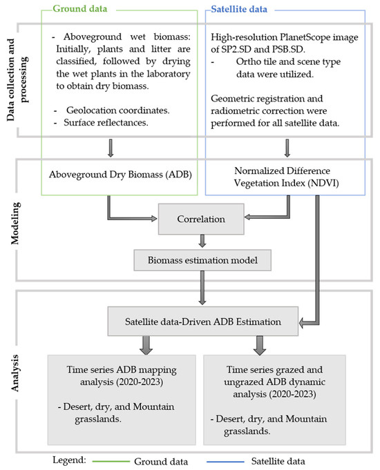 The study process consisted of three main parts: data collection and processing, modeling, and analysis (Figure 1). The first section is divided into ground data and satellite data. Ground data included measurements of biomass, surface reflectance, and geometric coordinates of both the measurement points and ground control points. These on-site measurements were conducted with precision by our dedicated research team.