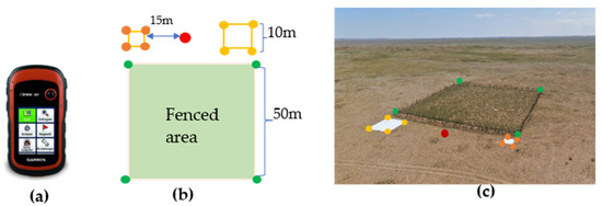 Geographic coordinate measurement process. (a) Garmen Etrex 20×. (b) Measurement design for research area. The green points represent the corner coordinates of the fence, the orange points are the coordinates of the white sheet (3 m × 3 m), the yellow points are the white sheet (10 m × 10 m), and the red point represents the biomass measurement point. (c) Image of the desert grassland research area.
