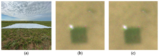 White sheet usage for geometric registration. (a) Ground image in dry grassland. (b) PlanetScope image in dry grassland on 1 August 2023. (c) PlanetScope image of geometrically registered dry grassland on 1 August 2023.
