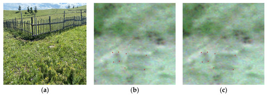 For instance, Figure 6 illustrates the geometric registration for a PlanetScope 3B-scene image captured on 1 August 2023, over the study site of the dry grassland area. Figure 6a presents the field view, Figure 6b displays the PlanetScope image before geometric registration, and Figure 6c showcases the PlanetScope image after geometric registration. During this registration process, red points served as ground control points, with white sheets specifically utilized for this purpose, resulting in a coordinate difference of 4.2 m. Similar processes are depicted in Figure 7 for desert grassland and Figure 8 for mountain grassland, revealing coordinate differences between ground measurements and satellite images of 3.3 m and 6 m, respectively.