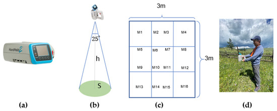 Surface reflectance measurement process. (a) ASD FieldSpec HandHeld2 Spectroradiometer. (b) Design of one measurement. (c) The measurements design for one plot. (d) Measurement process in mountain grassland.