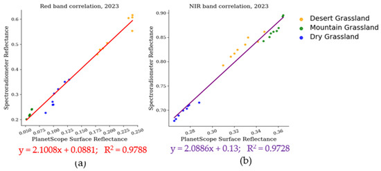 The resulting correlations for the grassland study area are shown in Figure 10, and the red band has a correlation of R2 = 0.9788 and the NIR band of R2 = 0.9728, respectively.