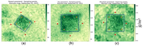 The predicted biomass map and time series analysis points on 1 September 2023. The color scale indicates the biomass values. (a) Desert grassland, (b) dry grassland, and (c) mountain grassland.