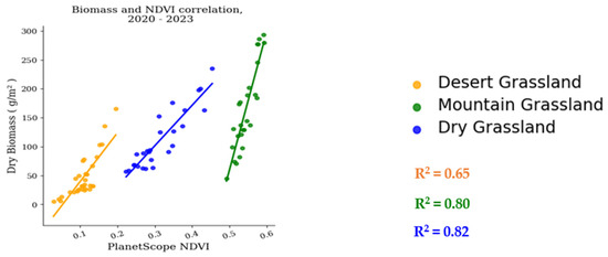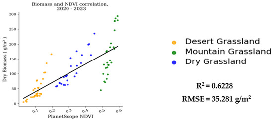 Separate correlations between ADB and PlanetScope-corrected NDVI were conducted for desert, dry, and mountain areas, and the regression lines are illustrated in Figure 13. The analysis of correlation gives a correlation coefficient of determination of 0.65 for desert grassland, 0.82 for dry grassland, and 0.80 for mountain grassland.