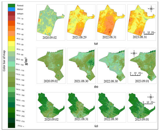 Utilizing the estimation model (Equation (10)) and the PlanetScope-corrected surface reflectance, biomass maps were created for Mongolia’s most minor administrative unit areas known as ‘Bags’ from 2020 to 2023. These ‘Bag’ areas also include the study sites of the research. The desert grassland area ‘Olon-Ovoo Bag’ in Dalanjargalan soum, Dornogovi province has a total area of 1610 km2 (depicted in Figure 14a), the dry grassland area ‘Lkhumbe Bag’ in Tumentsogt soum, Sukhbaatar province covers an area of 1189 km2 (shown in Figure 14b), and the mountain grassland area ‘Jargalant Bag’ in Mungunmorit soum, Tuv province encompasses a total area of 1241 km2 (as displayed in Figure 14c). All images were selected between August 30 and September 2 and were consistently mapped, categorizing color changes in intervals of 10 g/m2 across a biomass range from 0 g/m2 to 220 g/m2 (Figure 14).