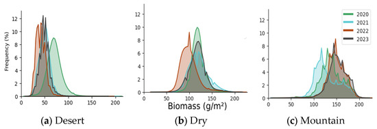 This uniform mapping approach enables meaningful comparative analysis. We also created the histograms of predicted ADB for each map (Figure 15). Figure 14 displays the predicted biomass map images and Figure 15 illustrates the histogram. In the desert grassland, the average recorded ADB was 44 g/m2, the maximum mean ADB recorded was 62 g/m2 in 2020, while the minimum mean ADB was 33 g/m2 in 2022 (Figure 14a and Figure 15a). For the dry grassland, the average recorded biomass was 105.25 g/m2. Its maximum mean ADB reached 111 g/m2 in 2021, while the minimum mean ADB was 91 g/m2 in 2022 (Figure 14b and Figure 15b). In the mountain grassland, the average recorded ADB stood at 133.5 g/m2. The maximum mean ADB recorded was 143 g/m2 in 2023, while the minimum mean ADB was 120 g/m2 in 2021 (Figure 14c and Figure 15c). Table 3 provides the predicted quantitative results for ADB.