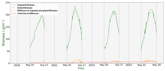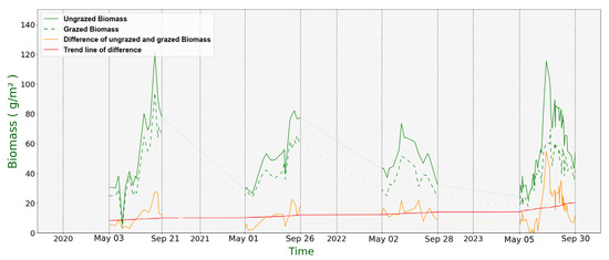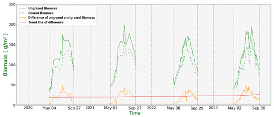 The trend lines representing these differences are depicted with a red line. In Figure 16, Figure 17 and Figure 18, the trend lines illustrating the differences in ADB values between ungrazed and grazed grassland areas show an increasing trend over time. These trend lines were generated by fitting a linear regression model to the differences in biomass values over time, using the least squares method. This trend potentially suggests the possibility of grassland degradation attributable to overgrazing and human factors.