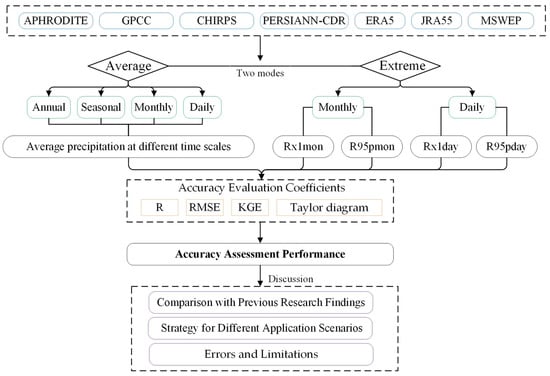 In this paper, the applicability of seven precipitation products in the EBYRB is evaluated by combining three accuracy coefficients and Taylor diagrams under different modes and time scales. At the same time, we discuss the evaluation process and results in three aspects: comparison, strategy selection, and error and limitations. The flowchart of the above research content and methodology is shown in Figure 2.