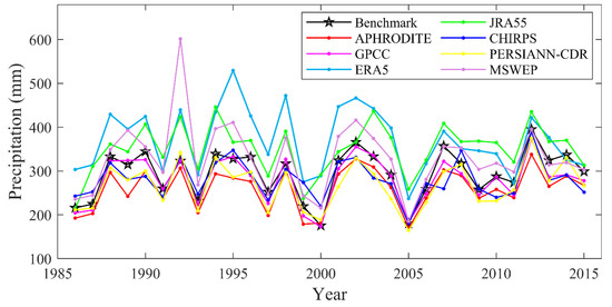 Temporal variations of the mean annual precipitation for the seven products and the benchmark dataset from 1986 to 2015 in the EBYRB.
