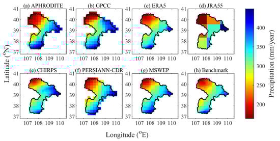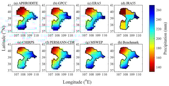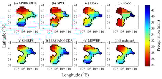Spatial patterns of the mean annual precipitation for the seven products and the benchmark dataset from 1986 to 2015 in the EBYRB.