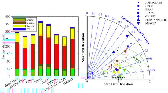 Histogram and Taylor diagram of the mean seasonal precipitation for the seven products and the benchmark dataset from 1986 to 2015 in the EBYRB. For this Taylor diagram, different colored markers represent the different seasons, with spring represented by green, summer by red, autumn by yellow, and winter by blue.