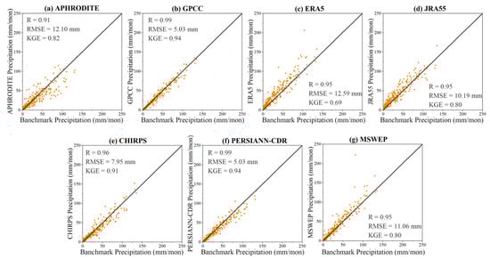 Scatter plot of average monthly areal precipitation between the seven products versus the benchmark precipitation from 1986 to 2015 in the EBYRB.