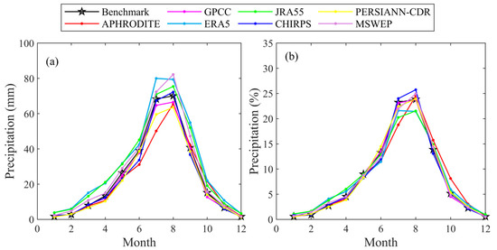 Time series of monthly precipitation for the seven products and the benchmark dataset from 1986 to 2015 in the EBYRB: (a) mean monthly precipitation and (b) contribution rate of mean monthly precipitation to mean annual precipitation.