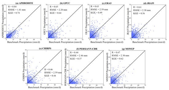 Scatter plot of average daily areal precipitation between the seven products versus the benchmark precipitation from 1986 to 2015 in the EBYRB.