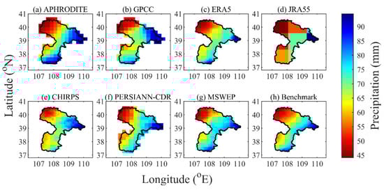 The spatial distribution patterns of the monthly scale extreme precipitation (Rx1mon and R95pmon) for the seven precipitation products and benchmark precipitation are very similar (Figure 11 and Figure 12), and they can basically reflect the trend of extreme precipitation increasing from northwest to southeast on a monthly scale. For the spatial distribution of the Rx1mon, the precipitation in the northwest of the study area is less, with the Rx1mon about 70.0 mm, and the precipitation in the south and east is more, with the Rx1mon about 110.0 mm. Specifically, APHRODITE and GPCC overestimate the east of the study area, while CHIRPS underestimates the south of the study area. ERA5, PERSAINN-CDR, and MSWEP can accurately display the distribution of extreme precipitation. The R95pmon has similar spatial distribution characteristics to the Rx1mon, but the value is lower. The R95pmon in the northwest of the study area is about 50.0 mm, and the R95pmon in the southeast is about 85.0 mm.