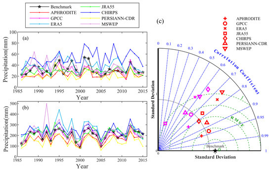 Extreme precipitation on a daily scale for the seven products and the benchmark dataset from 1986 to 2015 in the EBYRB: (a) time series of Rx1day; (b) time series of R95pday; and (c) Taylor diagram of Rx1day (magenta) and R95pday (red).