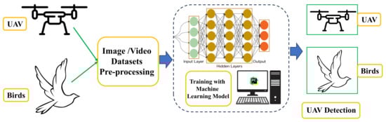 73]. DL networks are specifically designed for instantaneous UAV recognition, distinguishing them from traditional UAV detection systems. These networks classify inputs into various UAV classes, identifying the category, position, as well as the presence or absence of different UAV types [