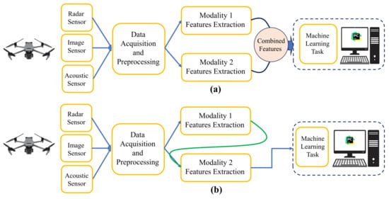 205] introduced a multimodal DL technique for combining and filtering data from many unimodal UAV detection techniques. To conduct UAV identification predictions, they used a combined set of data from three modalities. Specifically, an MLP network was utilized to combine data from thermal imaging, vision, and 2D radar in the form of range profile matrix data. To enhance the accuracy of deductions by combining characteristics collected from unimodal modules, they provided a generic fusion NN architecture. Multimodal features from both positive UAV and negative UAV detections make up the training set. The system achieved precision, recall, and F1-scores of