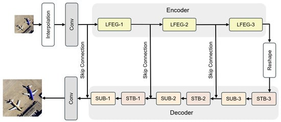 After passing through the encoder composed of convolutional structures, we will use Swin Transformer Blocks (STB) and SUB to gradually upscale and restore image details.
