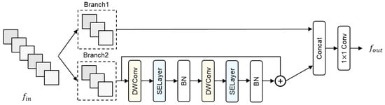 In branch1, features are extracted as usual through the subsequent two convolutional layers. In branch2, is directly concatenated with the features extracted in branch1. Finally, a 1 × 1 convolution is used for information fusion, producing the output feature . This process can be mathematically described as follows: