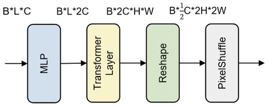 The structure of our SUB is shown in Figure 4. The input sequence of tokens is first dimensionally transformed through the MLP layer, where the MLP layer is able to introduce nonlinear transforms to enhance the model feature learning and expression capabilities, and also to double the channel dimension. The MLP is then followed by a layer of Swin Transformer to recover more details of the image. There are three layers of Swin Transformer in the decoder, each of which corresponds to three downsampling layers in the encoder part. After one layer of transformer, we rearrange the sequence of tokens into feature maps of B × 2C × H × W and then go through a Pixel Shuffle operation to change the resolution of the feature maps to of the input and the dimension of the channels to of the input. Finally, we change the sequence of tokens into the form of feature maps mainly to facilitate the fusion with the features extracted from the convolution in the encoder.